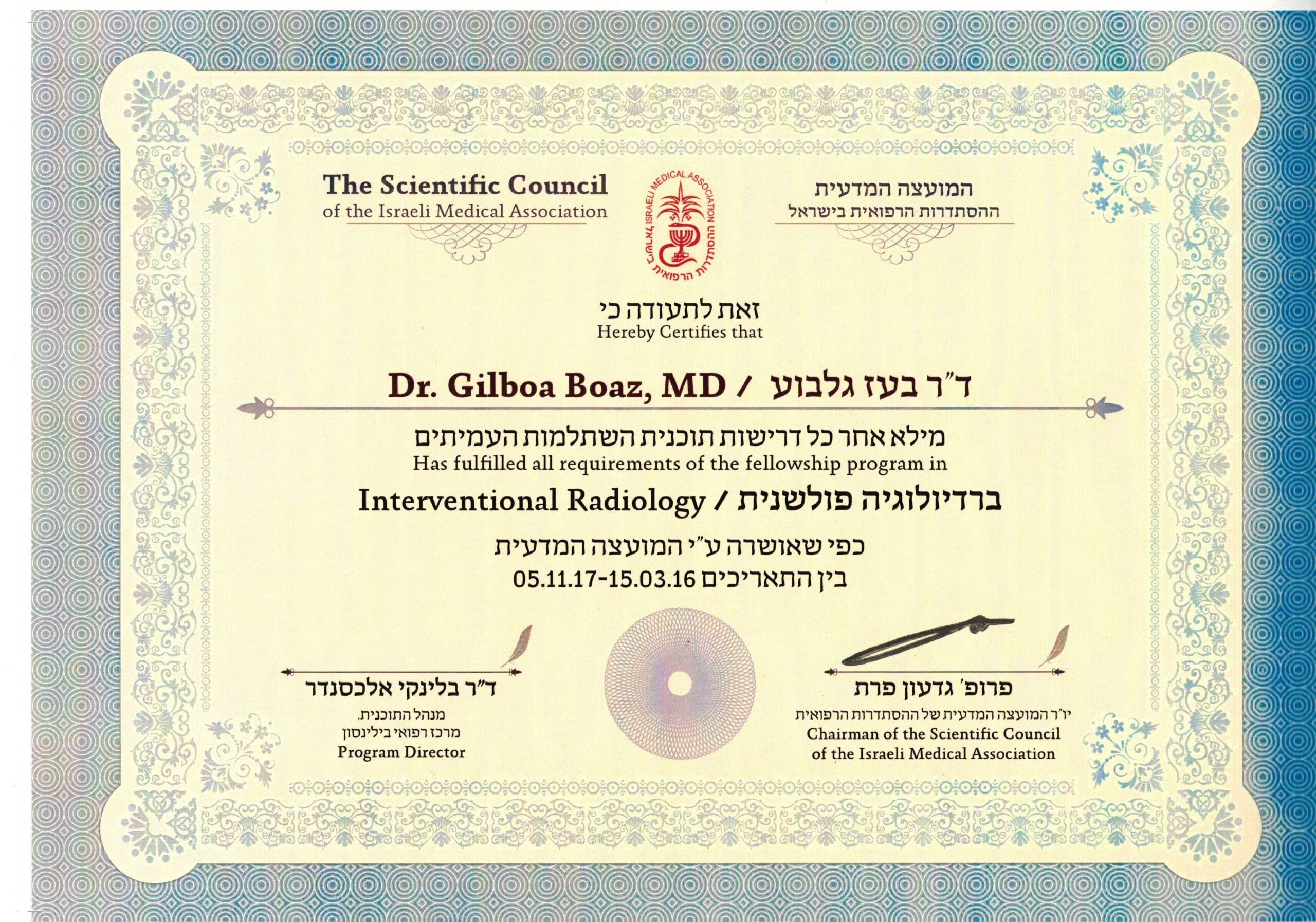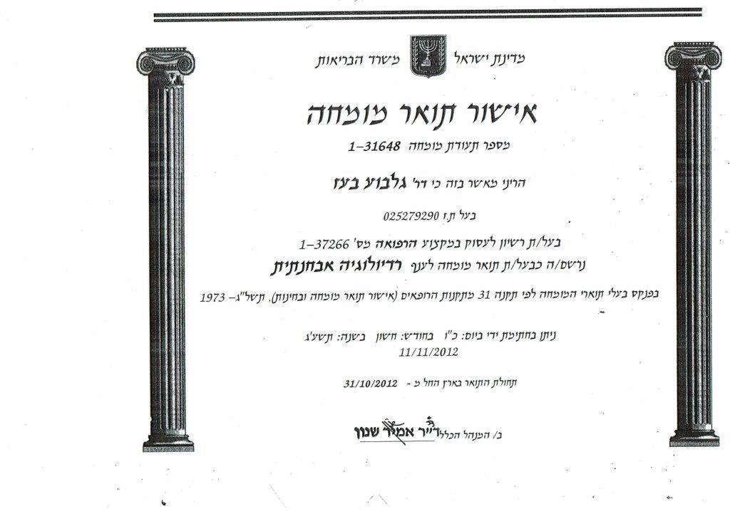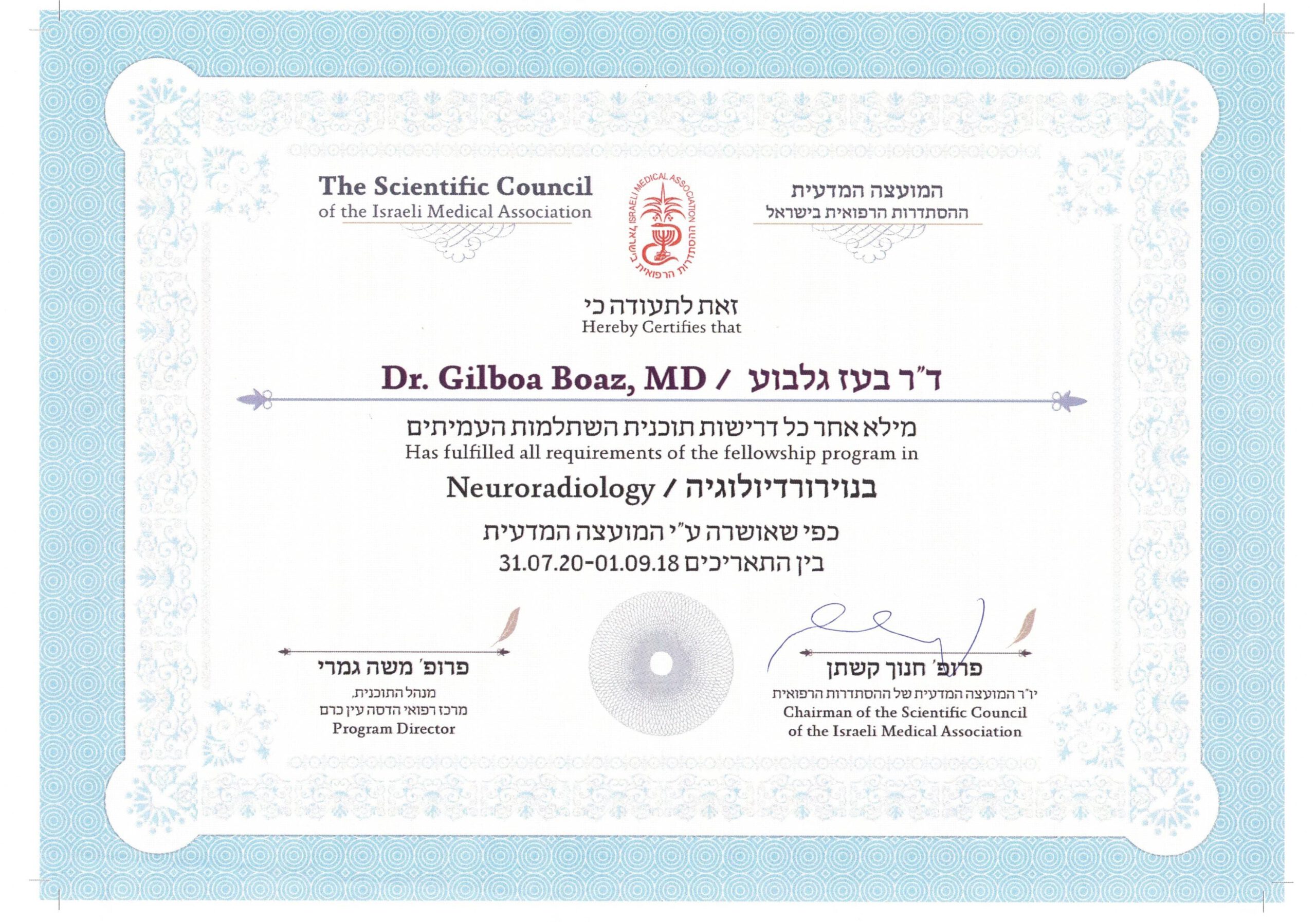 ד"ר בעז גלבוע, רופא מומחה ברדיולוגיה מזה למעלה מעשור, רופא בכיר במחלקה לדימות המוח בבית החולים הדסה עין כרם, בוגר הטכניון ברפואה, בעל התמחות ברדיולוגיה ומספר תתי התמחויות בתחומים רבים ומגוונים ובעל ידע נרחב.